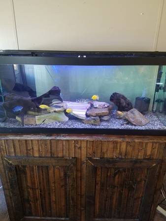 75 Gallon with Large Wood Cabinet. Currently freshwater. This was once a salt tank and it ready for sump and your favorite anemone or coral! $110